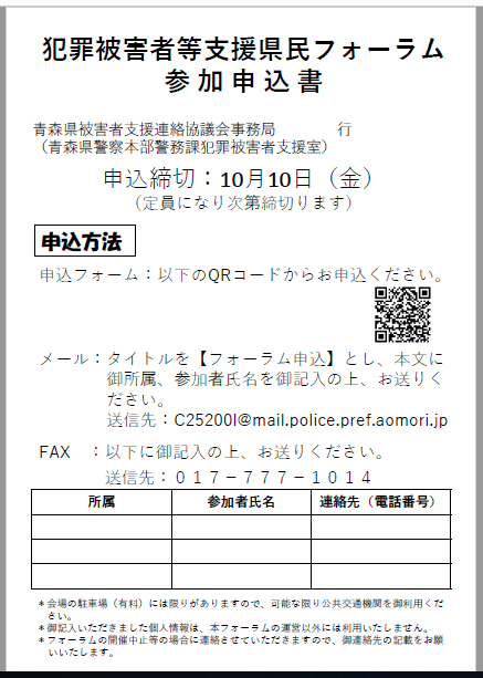 青森県被害者支援連絡協議会と公益社団法人あおもり被害者支援センターの共催により、「犯罪被害者等支援県民フォーラム」を開催します。