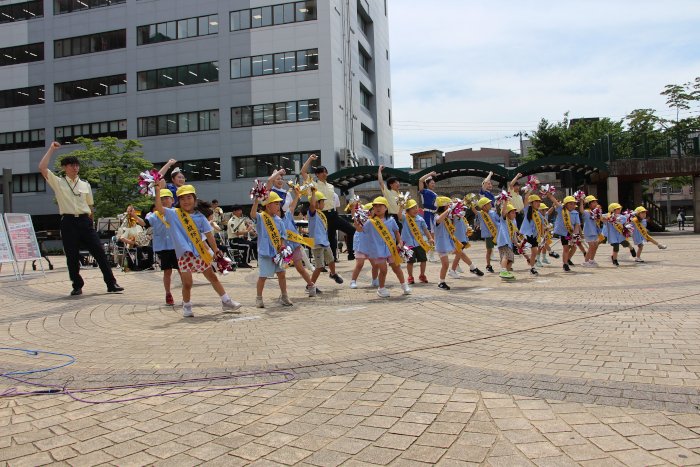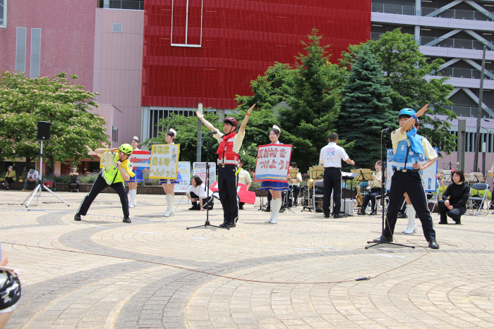 第二中学校と長者中学校と一緒にテーマソングを演奏し「横断歩道は歩行者優先~♪歩行者はピカピカ目立たなきゃ~♪自転車ヘルメットかぶらなきゃ~♪」などの交通事故抑止の歌詞を盛り込んだ歌とコミカルなダンスを披露し、来場者へ交通ルールを守るように呼びかけました!