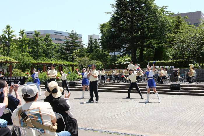 最後は、青森県警察音楽隊によるステージドリル を披露しました。ステージ上でのフォーメーション、カラーガードのフラッグ演技などさまざまな演出があり、見応えあり聴き応えありで、とても盛り上がりました!