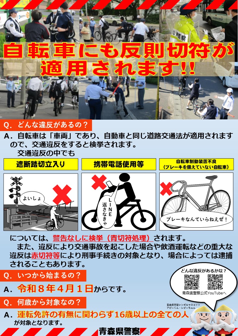 令和8年4月1日から、自転車の交通違反に交通反則通告制度(「青切符」制度)が導入されます。