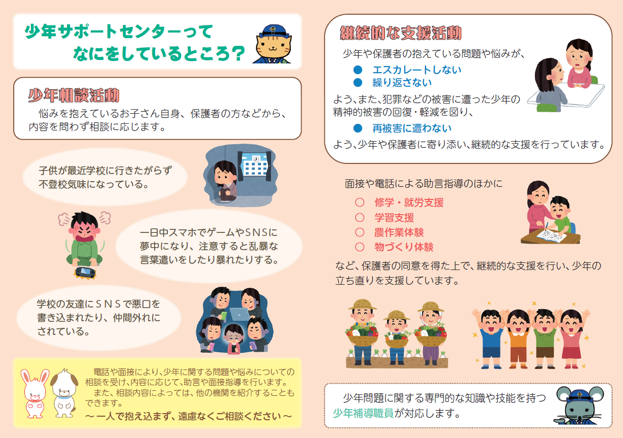 悩みや困り事を抱える少年や保護者から相談を受けるほか、問題行動のある少年、犯罪の被害に遭った少年が