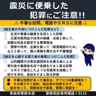 被災者の不安や被災を心配する第三者の善意につけこんだ犯罪にご注意ください。不審な訪問や不審電話があった場合は、すぐに110番通報、または、警察相談専用電 話#9110にご相談を!!