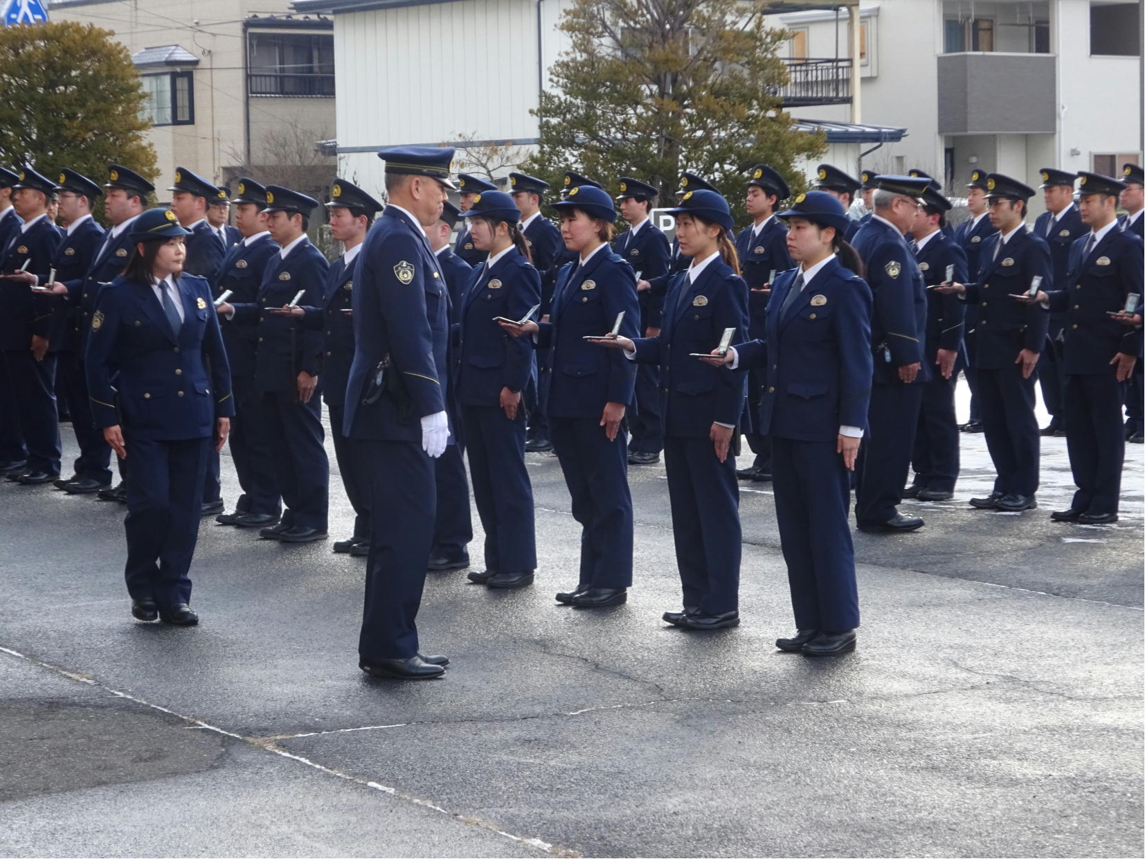 午前7時半から、警察署4階の会議室で出動式を開催し、その後、パトカーが警戒走行に出動するのを見送りました。