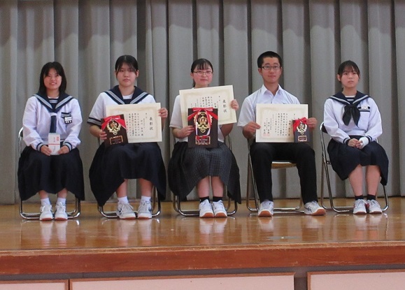 左から 泊中学校3年山崎結愛さん、横浜中学校3年杉山幸咲さん、第二中学校3年佐藤歩希さん、第一中学校3年高橋稜斗さん、野辺地中学校3年小坂萌さん