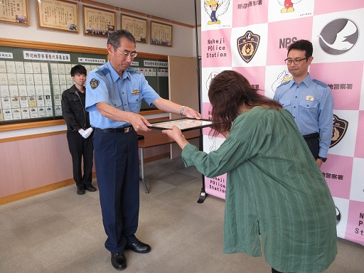 特殊詐欺被害防止に貢献していただいた管内の女性に感謝状を贈呈しました。(9月16日)